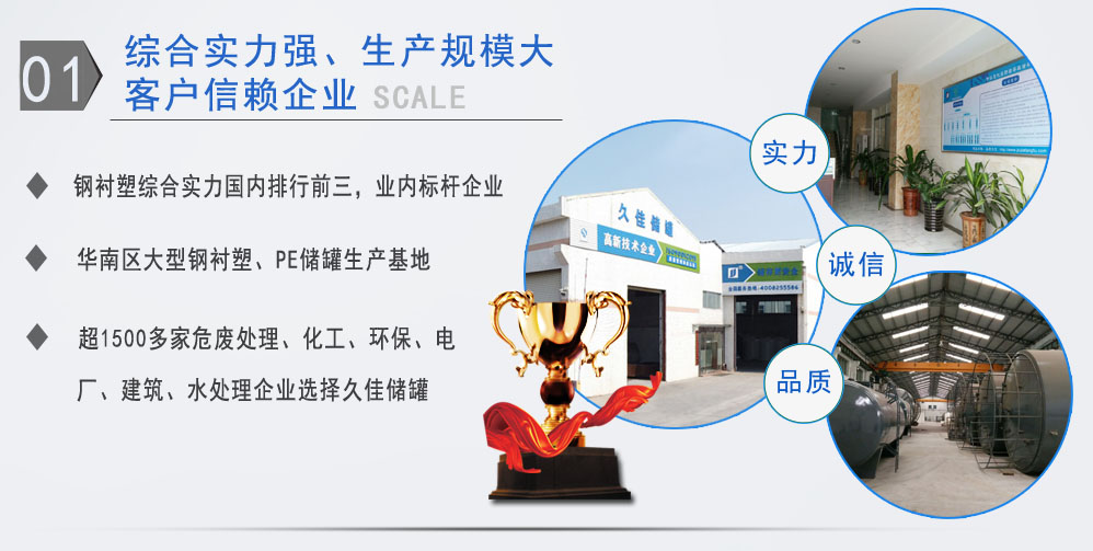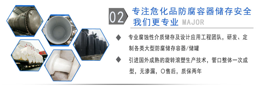 公司有鋼襯塑PE/PO、PE全塑、碳鋼、不銹鋼四大系列100多個品種,專注于常壓儲存容器生產,其產品包括鋼襯塑儲罐管口一體成型PE儲罐碳鋼儲罐、不銹鋼儲罐、反應釜、攪拌罐、離子交換柱、鋼襯PE/PO儲罐塑料儲罐、鹽酸儲罐硫酸儲罐等等。更大限度滿足廣大客戶的各種需求,同時可以根據客戶的需要加工定制各種防腐設備。